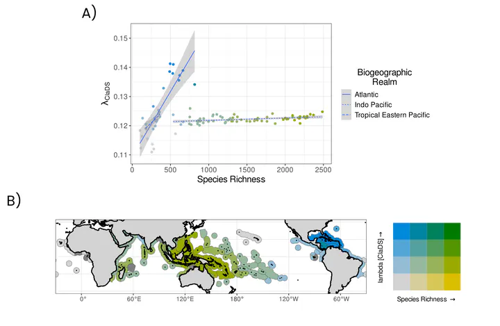 Aim In the tropical marine realm, the increasing concentration of reef fish species toward the Indo-Australian Archipelago (IAA) has been extensively studied. The literature provides numerous biogeographical scenarios explaining this pronounced longitudinal diversity gradient. However, most proposed scenarios did not consider the interplay between recent speciation and trait evolution, nor the influence of diversity-dependent processes. Location Global and regional. Taxon Tropical reef fishes. Methods Based on a global data set on tropical reef fish distributions, combined with species traits (body size, trophic level and maximum depth range) and a comprehensive Actinopterygii phylogeny, we derived assemblage-level speciation rates across the world’s tropical marine ecoregions, as well as assemblage-level trait evolution rates. We then apply a causal modelling approach that simultaneously accounts for the potential influence of both current and past environmental conditions on rates of recent speciation and trait evolution, and ultimately, on species richness distribution. Results Our results reveal gradients in speciation rates and trait evolution rates that do not match the spatial distribution of species richness. Compared to other regions, the species-rich IAA did not exhibit higher rates of either recent speciation or trait evolution. In contrast, the Caribbean region exhibited the greatest rates of recent speciation, but this pattern was uniquely driven by the recent radiation of hamlets (Hypoplectrus spp.). Caribbean and southwestern Atlantic reefs were also shown to harbour species with, on average, faster recent evolution in body size and maximum depth. Finally, regardless of the biogeographic realm considered (Indo-Pacific, Atlantic or Tropical Eastern Pacific), species richness was found to strongly constrain trait evolutionary rates related to trophic level. Main Conclusions Overall, our findings suggest that the longitudinal gradient in tropical reef fish diversity is unrelated to either recent speciation or recent trait evolution, and that the IAA no longer functions as a centre of origination for tropical reef fishes. Our results also suggest that diversity-dependent mechanisms may have played a key role in shaping biogeographic patterns of recent evolution of trophic level in tropical reef fishes.